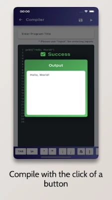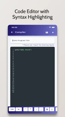 Python Compiler is an Advanced IDE enabling you to compile Python Programs on your Mobile Phone for Free. It comes with a code editor with in-built syntax highlighting capabilities.
