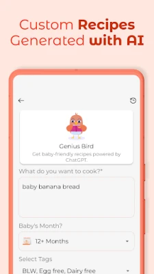🤖 AI-Generated Recipes: Utilize artificial intelligence to create customized baby recipes based on your baby's age and nutritional needs. Whether you're looking for vegan, vegetarian, lactose-free, or gluten-free baby food, our app considers all dietary preferences and baby allergies.