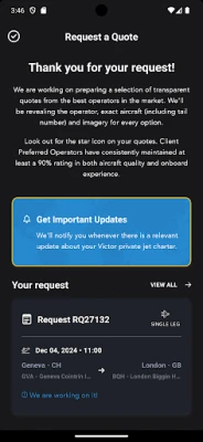 The Victor app has been built for convenience. From simple one-ways, to complex itineraries, you can access the market as quickly as possible.